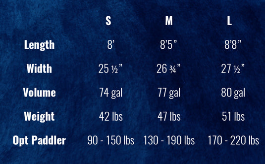 - Length: 8' (Small), 8'5" (Medium), 8'8" (Large)