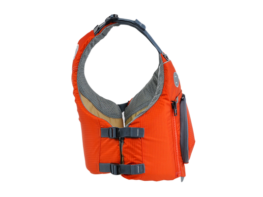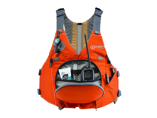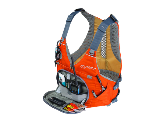 Fishing PFDs commonly include many pockets. It can get confusing what is where, and the pockets create obstacles for the rod handle. Astral consolidated five pockets into one large centralized place. The result is a streamlined yet highly organizable PFD, for more efficient fishing.